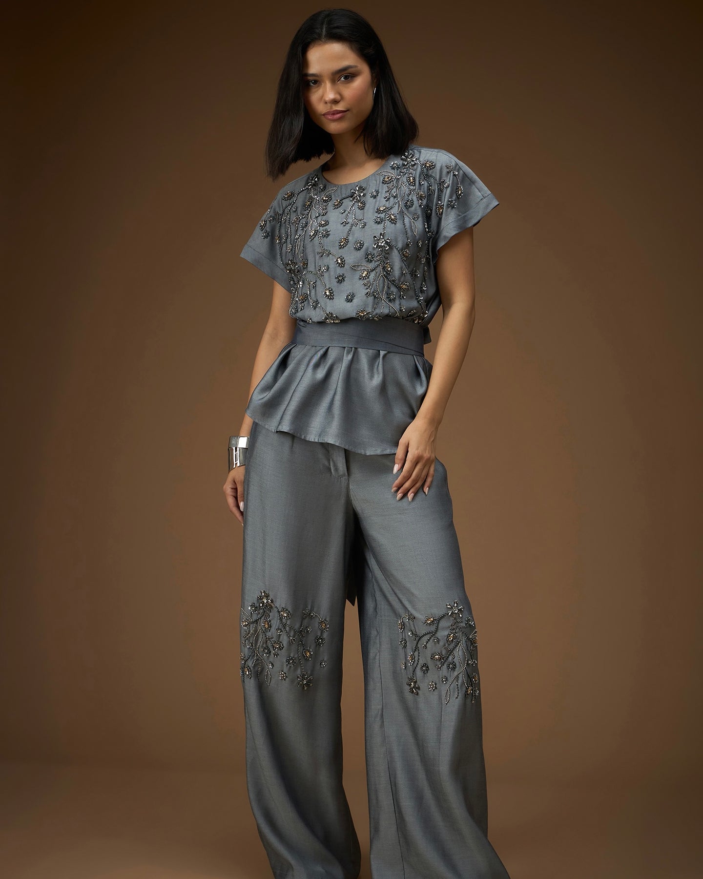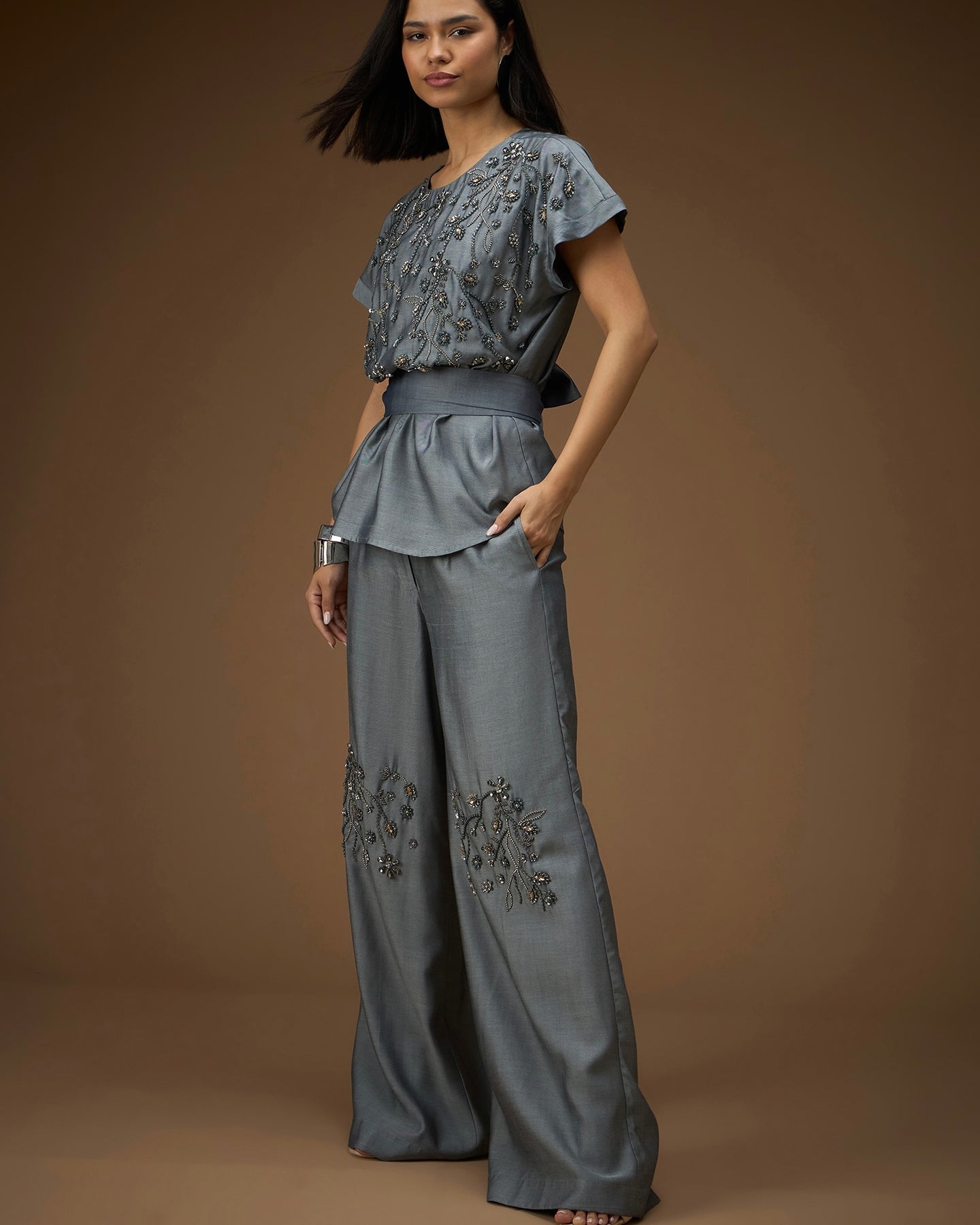 HAND EMBELLISHED TOP PAIRED WITH MATCHING BELT AND HAND EMBELLISHED WIDE-LEG PANTS