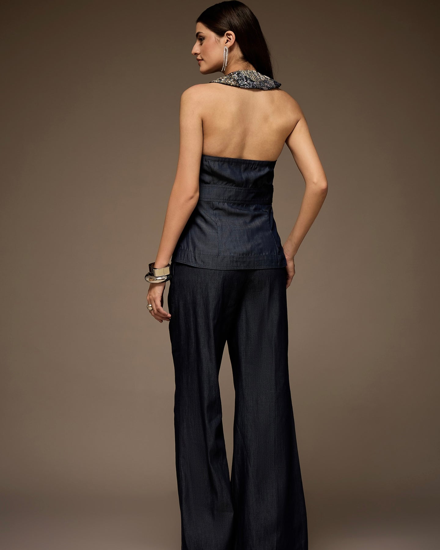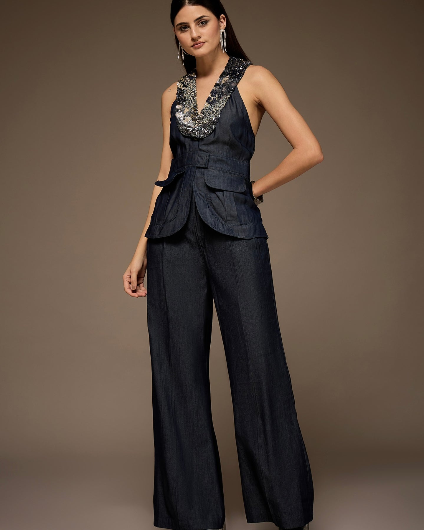 HAND EMBELLISHED HALTER NECK WAISTCOAT PAIRED WITH MATCHING WIDE-LEG PANTS