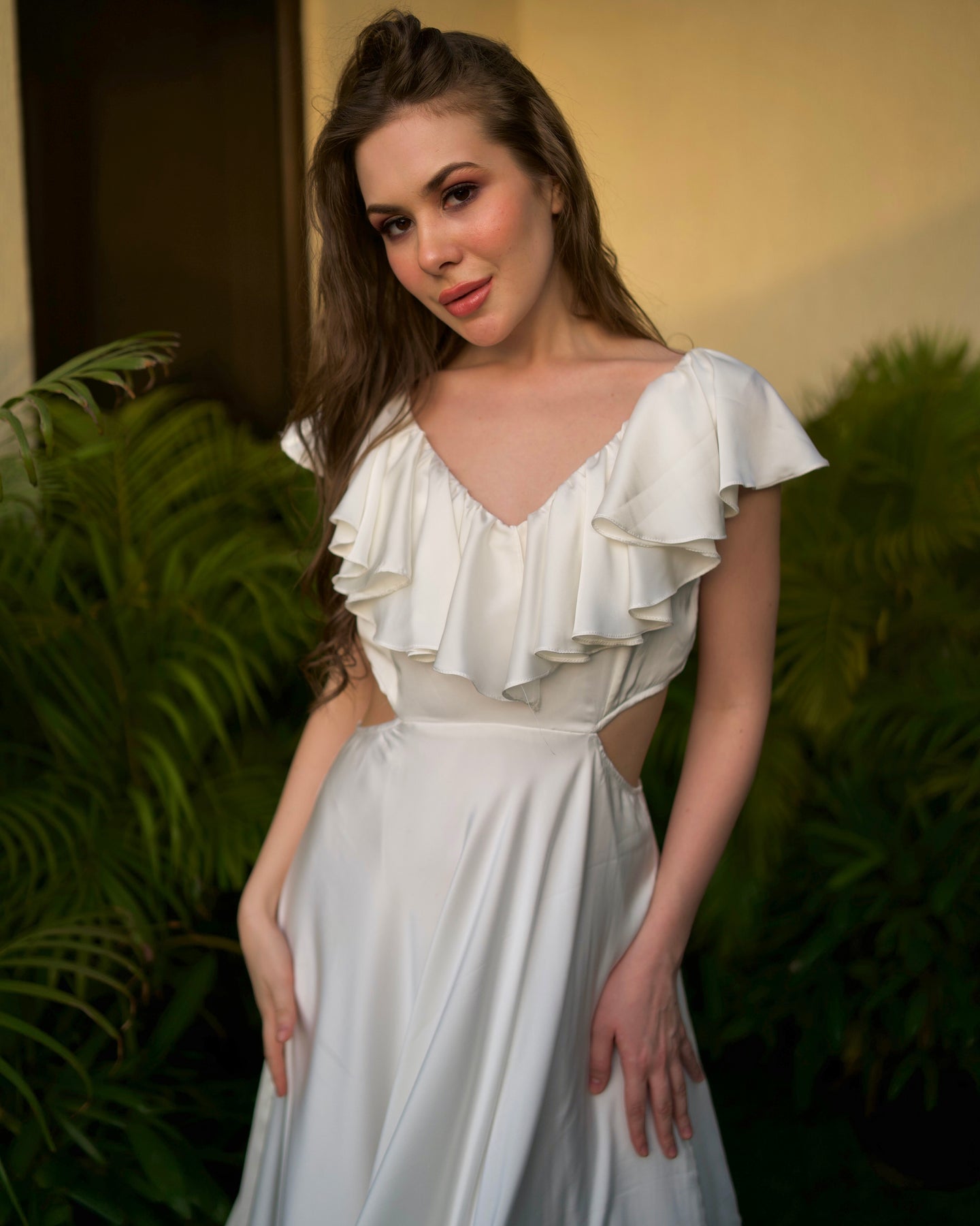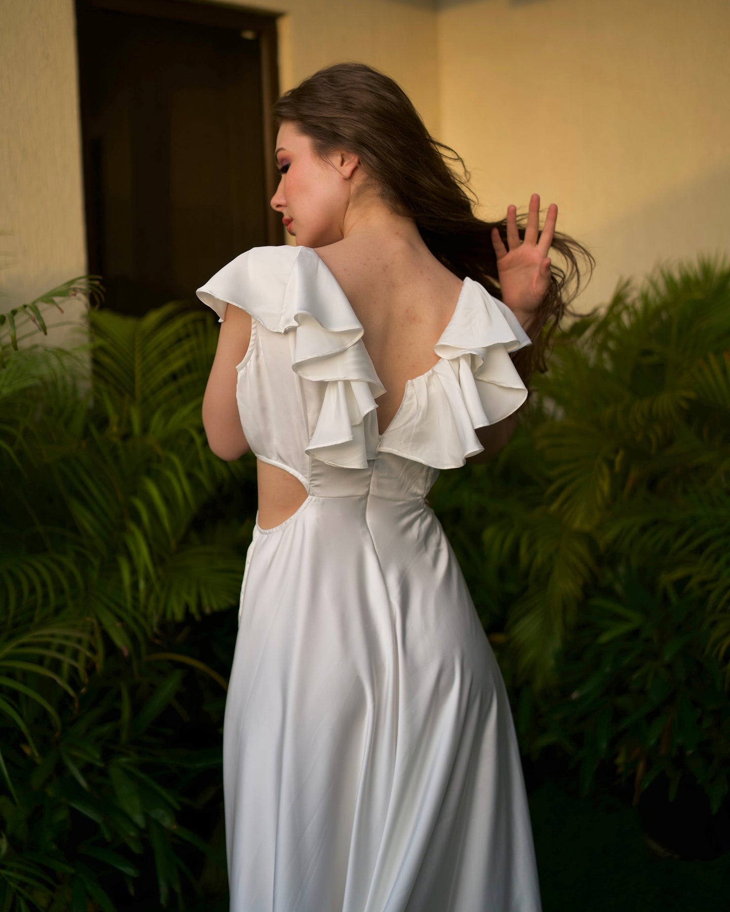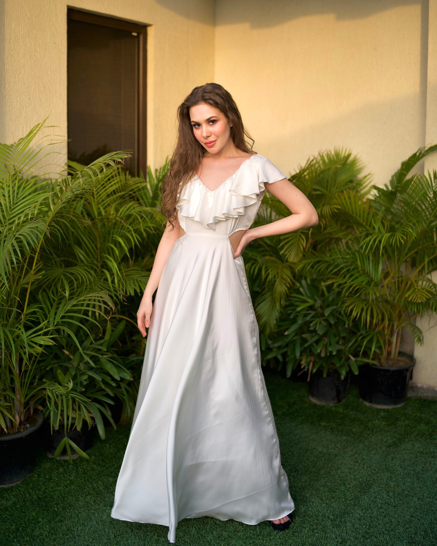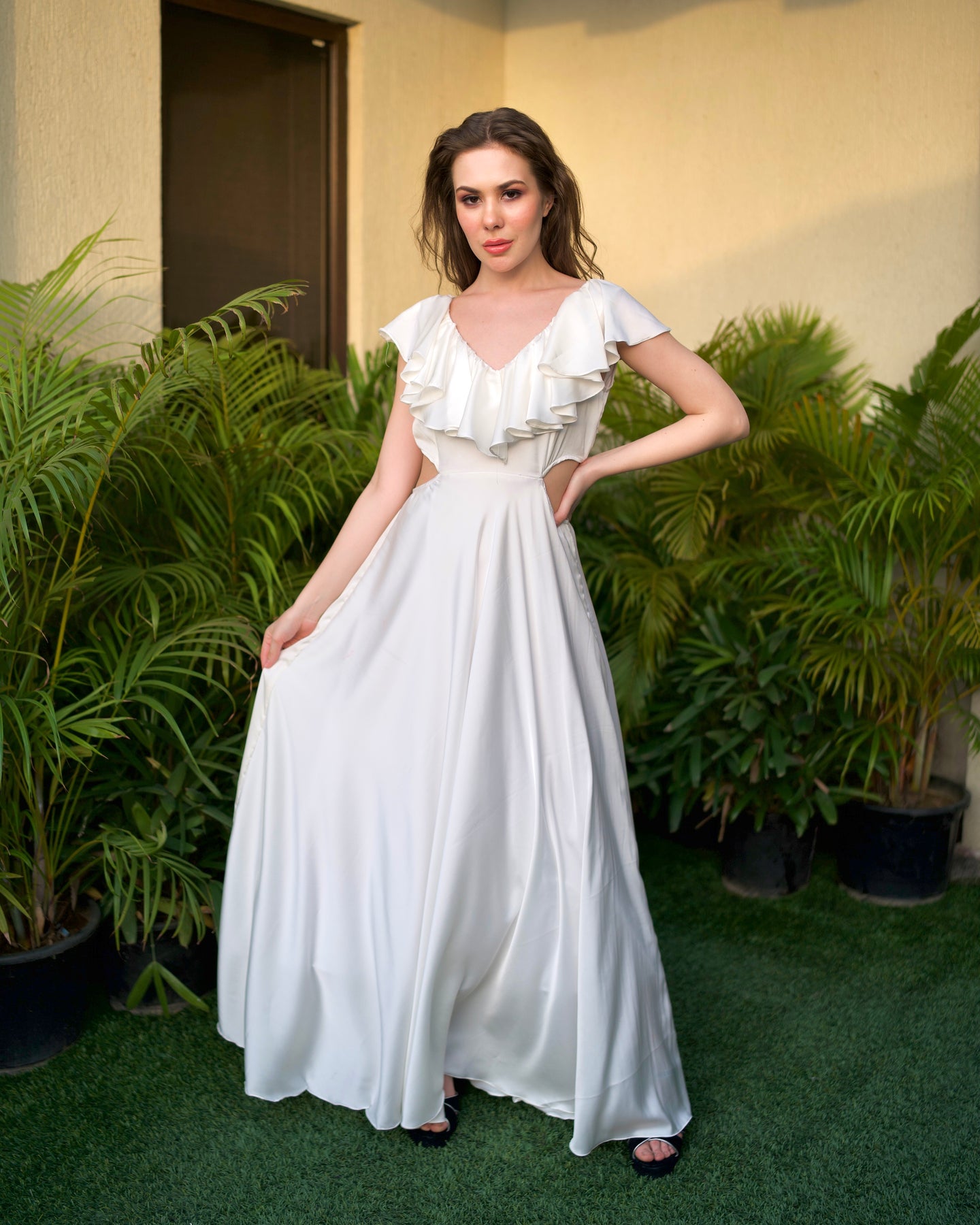 Details Ruffle satin gown with side cut detailing