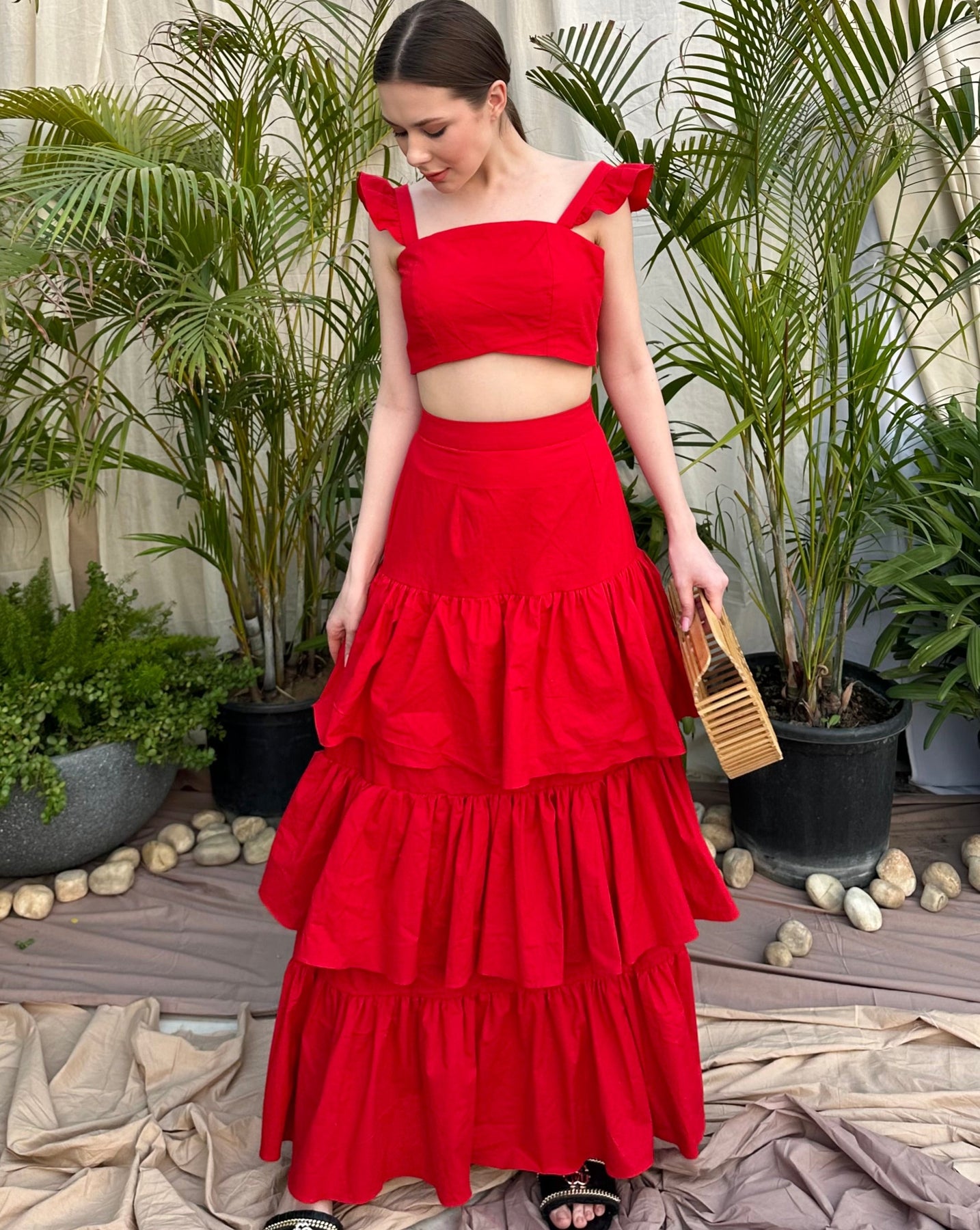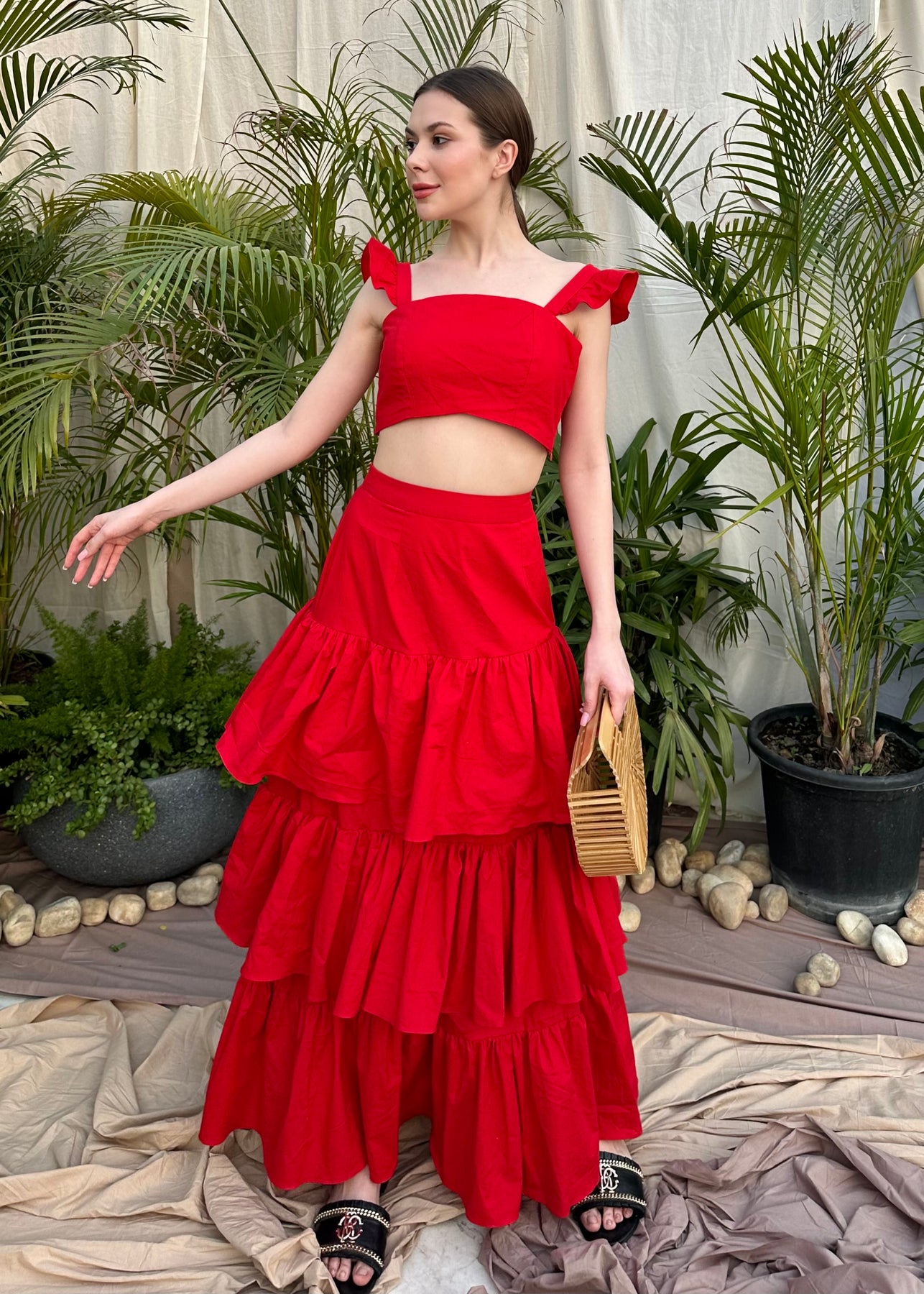 Verona is a 2pc set that includes a crop top with ruffle sleeves paired with a matching multi tiered maxi skirt.